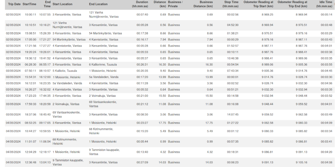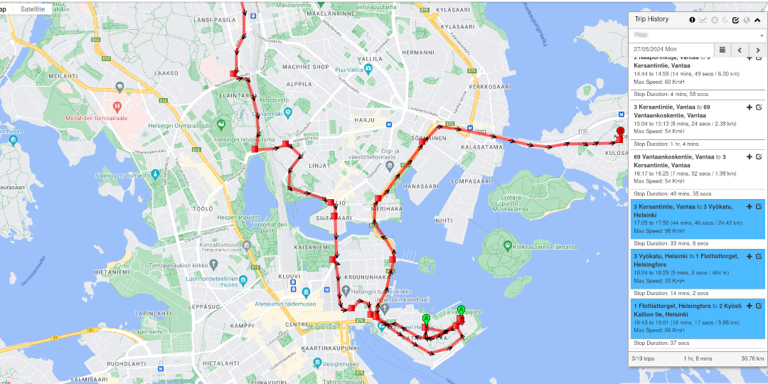 - Reaaliaikainen paikannus, ajopäiväkirja, ajotapa