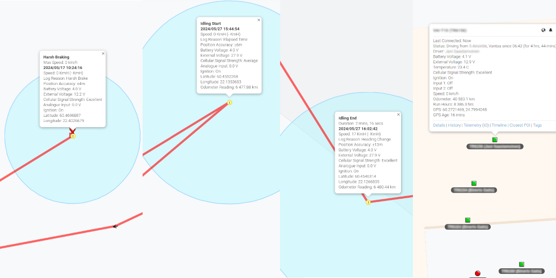 Karttapisteellä oleva info -kupla voidaan muokata näyttämään mitä kulloinkin on tärkeää: Kuljettaja, ajoaika ja -matka, kokonais tunti / km -kertymä, onko kyse tyhjäkäynnistä, kauanko tyhjäkäynti kesti. Palvelu myös esittää kohdat joissa on tapahtuma; Kova jarrutus, kiihdytys, ylinopeus. Käyttäjä voi luoda näitä tapahtumia itse vaikka kuorman lämpötilasta, koneen käytöstä väärään aikaan jne.